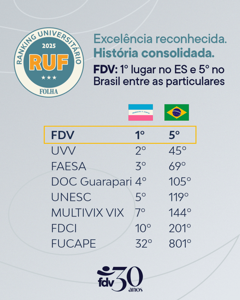 Divulgado nesta segunda-feira, 10 de novembro de 2025, o novo Ranking Universitário Folha (RUF 2025), posiciona novamente a FDV entre as instituições mais bem avaliadas do país. A FDV conquistou o 1º lugar do Espírito Santo e a 5ª colocação nacional na área de Direito entre as particulares, mantendo-se entre as principais referências do ensino jurídico brasileiro.