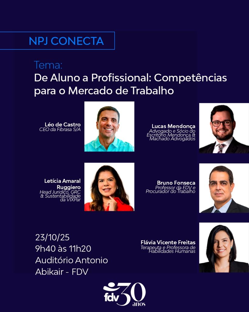 No dia 23 de outubro de 2025, das 9h40 às 11h20, o Núcleo de Prática Jurídica (NPJ/FDV) realizará, no Auditório Antonio Abikair, a primeira edição do NPJ Conecta com o tema: “De Aluno a Profissional: Competências para o Mercado de Trabalho”, voltado para alunos a partir do 7º período que desejam se destacar na carreira jurídica.