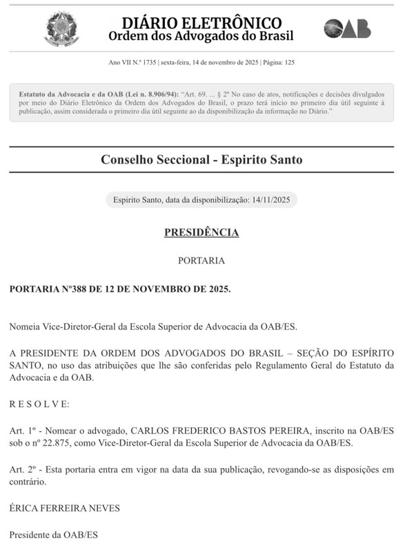 O professor Frederico Bastos, foi nomeado Vice-Diretor Geral da Escola Superior da Advocacia da OAB/ES (ESA/ES) pela Presidente da Ordem, Érica Ferreira Neves. A nomeação reforça a projeção acadêmica e profissional do professor, que já atuava como Coordenador do Departamento de Direito Processual da ESA/OAB-ES, função que continuará exercendo paralelamente ao novo cargo.