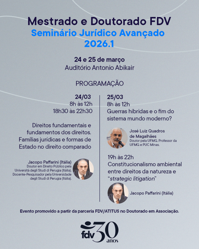 A programação conta com a participação do professor italiano Jacopo Paffarini, que aborda o tema “Direitos fundamentais e fundamentos dos direitos. Famílias jurídicas e formas de Estado no direito comparado”, com atividades ao longo do dia.