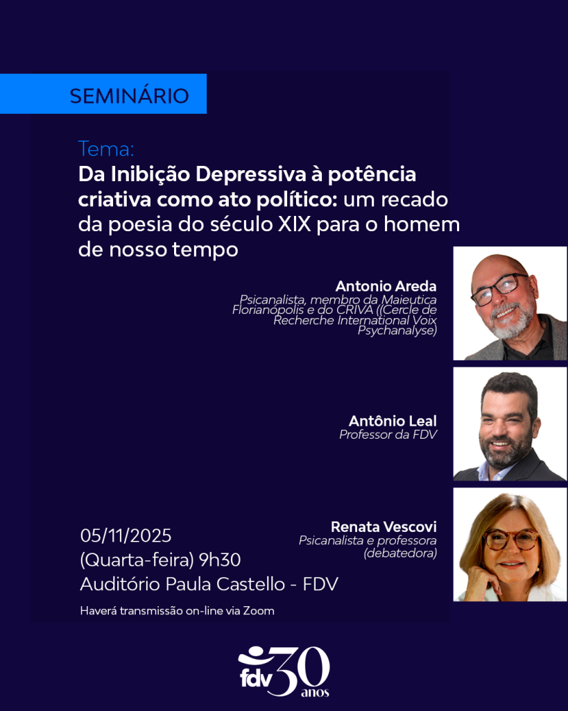 No dia 5 de novembro de 2025, a Faculdade de Direito de Vitória (FDV) sediará o seminário “Da inibição depressiva à potência criativa como ato político: um recado da poesia do século XIX para o homem de nosso tempo”, um encontro interdisciplinar que propõe refletir sobre as dimensões subjetivas, políticas e poéticas da criação humana.